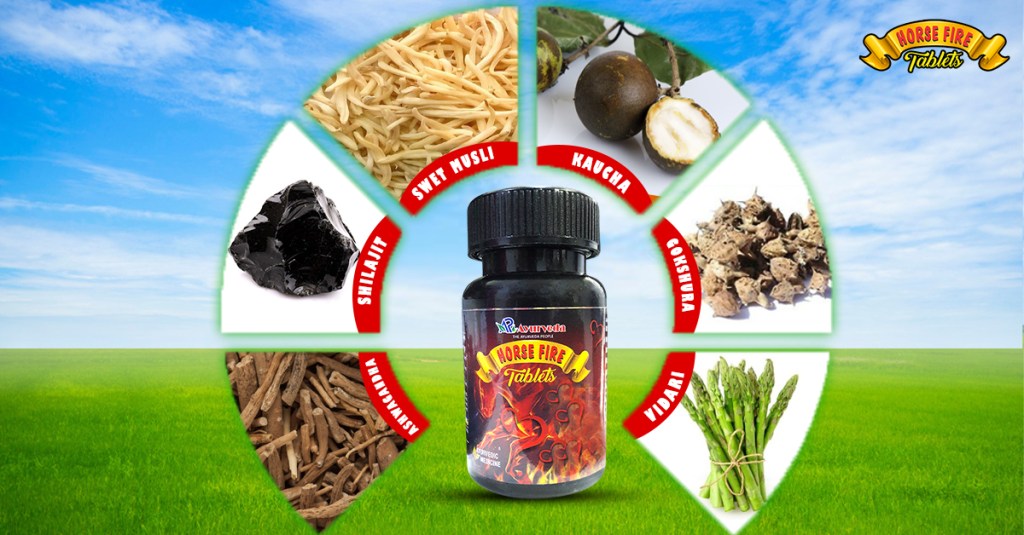 शिलाजीत, अश्वगंधा, कौचा, विदारी, गोकशुरा, स्वीट मूसली, सत्वा, गिलोय, वन्य भस्म और अबरक भस्म जैसी औषधियो का सही प्रमाण और योग्य सवरूप से हॉर्स फायर टैबलेट बनाया हुआ है| अश्वगंधा, शतावरी, मुसली और शुद्ध कौचा, ये ऐसी महान औषधियां हैं जिनमे घोड़े (अश्व) जैसी ताकत का राज छिपा है | हॉर्स फायर टैबलेट जो शरीर के रक्त परिसंचरण में सुधार लाता है और सेल को विकसित करता है। यह टेस्टोस्टेरोन के स्तर को बढ़ाता है, यह लिंग को हार्डकोर इरेक्शन देता है और स्तंभन समस्याओं को ठीक करता है। यह एक आयुर्वेदिक प्राकृतिक और सुरक्षित उपचार है।